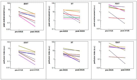 Likewise, power Doppler parameters showed a significant reduction in perfusion kinetics after AVUS therapy, where VAR decreased from 59.8 ± 12.8 a.u. to 20.6 ± 8.5 a.u., p = 0.02, with a 65.5% decrease, and FVPI decreased from 31.37 ± 7.78 to 8.32 ± 1.39, 70.35, p = 0.004.