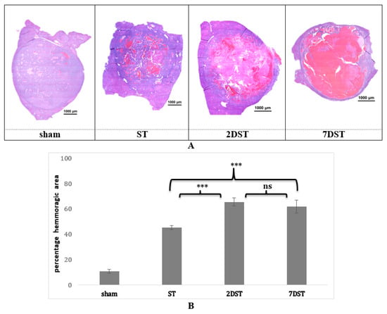 (A) Hematoxylin and eosin (H&E) staining of the HCC tumor samples. Small hemorrhagic pools are seen in the tumors treated with a single (ST) compared to larger pools seen in subsequent (2DST, 7DST) therapies. More necrotic tissue is seen in 7DST tumors. No sensible change observed in sham cases. Area enclosed within the broken line represents the tumor. (B) Quantitative analysis of the hemorrhagic area of the HCC tumor samples. The bars represent the percentage of hemorrhagic area in the sham tumors, or treated with sham, single (ST) or subsequent in two days (2DST) or subsequent in seven days (7DST). The difference in the percentage of hemorrhagic area between sham vs. single Rx (p < 0.001), sham vs. 2DST and 7DST (p < 0.001), and ST vs. 2DST and 7DST (p < 0.001) were statistically significant. *** represent significant difference between groups, while ns means non-significant difference.