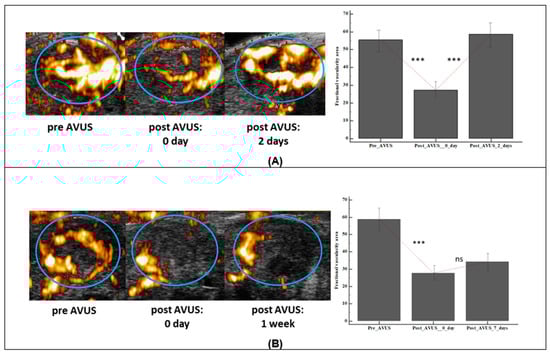 An interesting observation in the subsequent therapy tumor groups is that, following the first AVUS treatment, tumor perfusion increased to the baseline level over the first two days, while it did not show the same pattern when evaluated after a week. These findings also indicate the viability of tumors within two days from the first therapy, as angiogenesis and the formation of new vessels make them ideal for a second therapy. On the other hand, seven days later, the tumor ages and loses some of its vascularity, making it less responsive to a subsequent therapy.