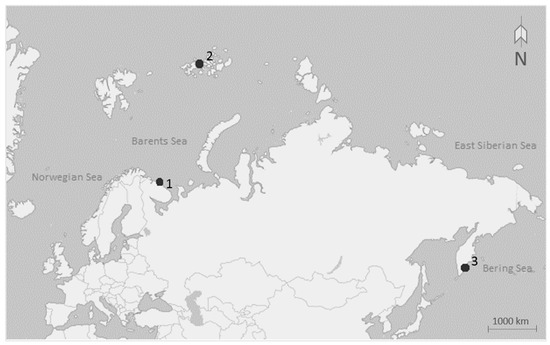 Map showing points of sample collection: (1) the coast of the Kola Peninsula 69° N, 36° W, (2) Franz Josef Land 80° N, 57° W, and (3) East Kamchatka, Starichkov Island 52° N, 158° E.