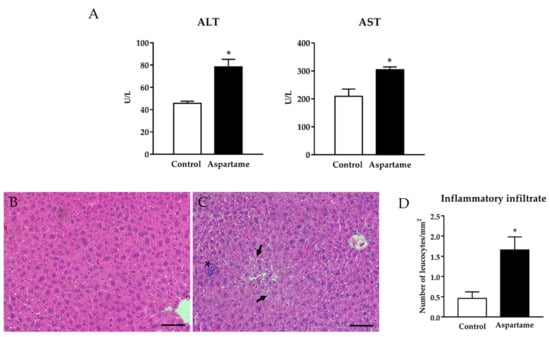 Alanine aminotransferase (ALT) and aspartate aminotransferase (AST) levels (A) were measured by spectrophotometry in the sera of control and aspartame-treated mice (n = 6, each group). Representative images of hematoxylin–eosin histological staining in the liver of control (B) and aspartame-treated mice (C). The asterisk indicates inflammatory infiltration while the arrow reveals a reduction in the nuclear volume and hepatocyte degeneration (n = 4, each group). Scale bar = 50 µm. Quantitative analysis of inflammatory infiltrate found in liver sections of mice belonging to the different experimental groups (n = 4, each group) (D). The statistical difference is indicated as follows: * p < 0.05 versus control.