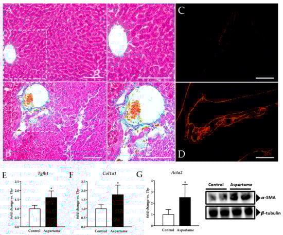 Based on the fact that aspartame intake generated injury in the mice liver, we investigated fibrosis through a histological analysis and also by measuring the gene expression of pro-fibrotic markers by RT-qPCR. Aspartame caused remarkable fibrosis as can be evidenced through the much higher deposition of collagen fibers in the mice liver (Figure 2B,D) than in the liver of control animals, where it was found to be almost absent (Figure 2A,C). Furthermore, transforming growth factor β 1 (Tgfb1) (Figure 2E), collagen type I alpha 1 (Col1a1) (Figure 2F), and alpha smooth muscle actin (Acta2) (Figure 2G) mRNA as well as α-SMA protein levels (Figure 2G, densitometry in Figure S1A) were upregulated in the mice livers upon aspartame treatment compared to the control animals.