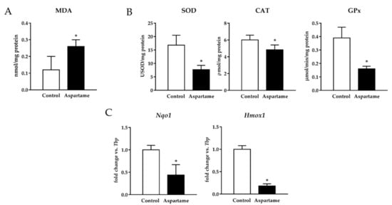 Malondialdehyde (MDA) levels were measured in the livers of control and aspartame-treated mice (n = 6, each group) (A). The activity of antioxidant enzymes superoxide dismutase (SOD), catalase (CAT), and glutathione peroxidase (GPx) measured by spectrophotometry in the livers of control and aspartame-treated mice (n = 6, each group) (B). mRNA relative expression of NADPH quinone oxidoreductase 1 (Nqo1) and heme oxygenase 1 (Hmox1) versus Tbp measured by RT-qPCR in the livers of control and aspartame-treated mice (n = 6, each group) (C). The statistical difference is indicated as follows: * p < 0.05 versus control.