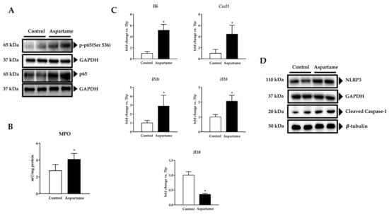 Representative image of Western blotting of phospho-p65 (Ser536) and p65 in the livers of control and aspartame-treated mice (n = 4, each group). Glyceraldehyde-3-phosphate dehydrogenase (GAPDH) was used as a loading control (A). Myeloperoxidase (MPO) activity in the livers of control and aspartame-treated mice (n = 6, each group) (B). mRNA relative expression of cytokines interleukin (IL) 6 Il6, chemokine (C-X-C motif) ligand 1 (Cxcl1), Ilb1, Il18, and Il10 versus Tbp measured by RT-qPCR in the livers of control and aspartame-treated mice (n = 6, each group) (C). Representative images of Western blotting of NOD-like receptor containing protein 3 (NLRP3) and cleaved caspase 1 in the livers of control and aspartame-treated mice (n = 4, each group). GAPDH and β-tubulin were used as the loading controls, respectively (D). The statistical difference is indicated as follows: * p < 0.05 versus control.