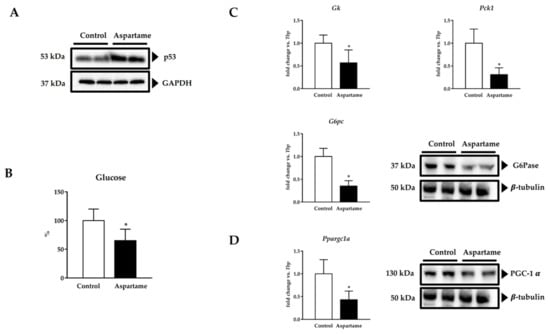 Representative images of Western blotting of p53 in the liver of control and aspartame-treated mice (n = 4, each group). GAPDH was used as a loading control (A). Fasting glucose levels were measured by spectrophotometry in the serum of control and aspartame-treated mice (n = 6, each group) (B). mRNA relative expression of gluconeogenic enzymes Gk, Pck1, G6pc versus Tbp measured by RT-qPCR (n = 6, each group) and representative image of Western blotting of G6Pase in the liver of control and aspartame-treated mice (n = 4, each group). β-tubulin was used as a loading control (C). mRNA relative expression of Ppargc1a versus Tbp measured by RT-qPCR (n = 6, each group) and representative image of Western blotting of PGC-1α in the liver of control and aspartame-treated mice (n = 4, each group). β-tubulin was used as a loading control (D). The statistical difference is indicated as follows: * p < 0.05 versus control.