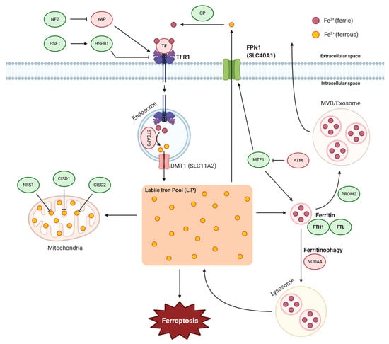 Iron metabolism regulates ferroptosis. Ferric iron (Fe3+, red circle) bound to TF can form a complex with TFR1 to be endocytosed into cells. In the endosome, ferric iron is reduced to ferrous iron (Fe2+, yellow circle) by STEAP3 and transported into the cytoplasm by DMT1 or SLC11A2. Ferrous iron is stored in ferritin heteropolymers to protect cells and tissues from iron-mediated damage. Ferritin can undergo ferritinophagy, an autophagic degradation process, or exported out of the cell as MVB/exosomes. In the mitochondria, iron-sulfur clusters can be used by iron-sulfur proteins in various processes. Dysregulation in any of the above processes can lead to an increase in the labile iron pool and contribute to ferroptosis. Ferroptosis inhibiting and inducing factors are indicated in green and red, respectively. (Abbreviations: ATM, ATM serine/threonine kinase; CISD1/2, CDGSH iron-sulfur domain-containing protein 1/2; CP, ceruloplasmin; DMT1, divalent metal transporter 1; FPN1, ferroportin; FTH1, ferritin heavy chain 1; FTL, ferritin light chain; HSF1, heat shock factor 1; HSPB1, heat shock protein beta-1; MTF1, metal-regulatory transcription factor 1; MVB, multivesicular bodies; NCOA4, nuclear receptor coactivator 4; NF2, neurofibromin 2; NFS1, NFS1 cysteine desulfurase; STEAP3, six transmembrane epithelial antigen of the prostate 3; TF, transferrin; TFR1, transferrin receptor 1; YAP, yes-associated protein).