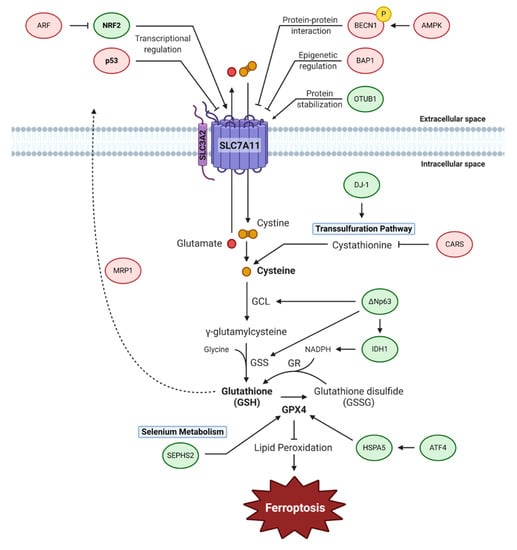The cyst(e)ine-glutathione-GPX4 axis regulates ferroptosis. The cystine/glutamate antiporter, system Xc−, is composed of two subunits, SLC7A11 and SLC3A2. System Xc− is the dominant pathway for regulating cysteine levels within cells by transporting cystine into cells. An alternate pathway for synthesizing cysteine is through the transsulfuration pathway. Cysteine is used as a substrate for glutathione biosynthesis, which is further used to activate GPX4 to inhibit lipid peroxidation. This antioxidative activity of GPX4 allows for the prevention of ferroptosis. Selenium metabolism is important for the activity of GPX4, which is a selenoprotein. Ferroptosis inhibiting and inducing factors are indicated in green and red, respectively. (Abbreviations: AMPK, AMP-activated protein kinase; ARF, alternative reading frame; ATF4, activating transcription factor 4; BAP1, BRCA1-associated protein 1; BECN1, beclin 1; CARS, cysteinyl-tRNA synthetase; DJ-1/PARK7, cancer- and Parkinson’s disease (PD)-associated protein; GCL, glutamate-cysteine ligase; GPX4, glutathione peroxidase 4; GR, glutathione reductase; GSS, glutathione synthetase; HSPA5, heat shock protein family A member 5; IDH1, isocitrate dehydrogenase 1; NADPH, nicotinamide adenine dinucleotide phosphate; ΔNp63, N-terminal truncated isoform of p63; NRF2, nuclear factor erythroid 2–related factor 2; OTUB1, OTU deubiquitinase, ubiquitin aldehyde binding 1; SEPHS2, selenophosphate synthetase 2; SLC3A2, solute carrier family 3 member 2; SLC7A11, solute carrier family 7 member 11).