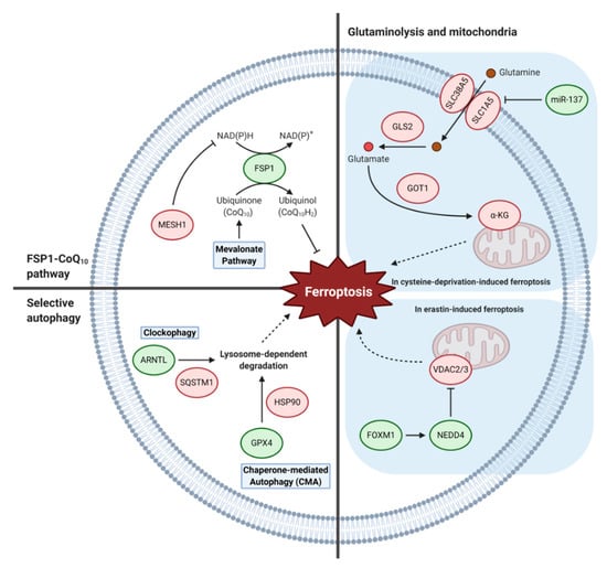 Other metabolic pathways that regulate ferroptosis. Aside from the main metabolic pathways, there are additional pathways that can regulate ferroptosis such as the FSP1-CoQ10 pathway, glutaminolysis and mitochondria-related pathway, and selective autophagy pathways. Ferroptosis inhibiting and inducing factors are indicated in green and red, respectively. (Abbreviations: α-KG, α-ketoglutarate; ARNTL, aryl hydrocarbon receptor nuclear translocator like; FOXM1, forkhead box protein M1; FSP1, ferroptosis suppressor protein 1; GLS2, glutaminase 2; GOT1, glutamate oxaloacetate transaminase 1; GPX4, glutathione peroxidase 4; HSP90, heat shock protein 90; MESH1, metazoan SpoT homologue 1; NADH, nicotinamide adenine dinucleotide; NADK, NAD kinase; NADPH, nicotinamide adenine dinucleotide phosphate NEDD4, neuronal precursor cell-expressed developmentally downregulated 4; SLC1A5, solute carrier family 1 member 5; SLC38A5, solute carrier family 38 member 5; SQSTM1, sequestosome 1; VDAC2/3, voltage-dependent anion channels 2 and 3).