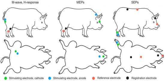 Electrophysiological tests were performed for intact and experimental pigs 2 and 11 weeks after SCI as previously described [12]. Figure 1 provides a schematic illustration of the electrode positions on the pigs. The animal’s neuromotor function was assessed by stimulating electromyography. M- and H-waves from the tibialis anterior muscle were recorded in response to stimulation of the sciatic nerve. Monopolar needle electrodes were used for both recording and reference. An active electrode was inserted into the middle of the muscle belly, with the reference electrode implanted within a region of the tendomuscular junction. Electrical stimulation of the sciatic nerve was carried out with square-wave single stimuli lasting for 0.2 ms. For stimulation, monopolar needle electrodes were inserted subcutaneously within the area where the sciatic nerve exits from the pelvis.