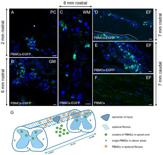 Distribution and survival of peripheral blood mononuclear cells (PBMCs)-EGFP in the area of spinal cord injuries (SCIs) in pigs. On day 14, Ad5–EGFP-labeled (green) PBMCs were located mainly in post-traumatic cavities (PC, asterisk) and around them at the epicenter of trauma (A). At a distance from the site of SCIs, EGFP-PBMCs were found mainly in the grey matter ((B), GM) and in small amounts in the white matter ((C), WM). The EGFP-PBMCs distribution can be seen in the area of epidural fibrosis (E); fewer EGFP+-cells were found above the rostral part of the spinal cord ((D); the dashed line indicates the dorsal surface of the spinal cord), and more in the synechias above its caudal part (E). The area of epidural fibrosis in pigs applied with Ad5–EGFP-unlabeled PBMCs is shown in (F). Nuclei are stained with 4′,6-diamidino-2-phenylindole (DAPI, blue). Scale bars: 10 µm. Schematic presentation of the EGFP-PBMC distribution in the area of epidural fibrosis and spinal cord tissue according to the distance from the site of injury (G).