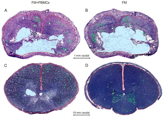 That tissue structure can be improved in the setting of PBMC transplantation to rodents with SCIs, as been previously shown; a decreased area of abnormal cavities and less damage of the myelin sheath were noted [5,16,17]. In our study, the application of FM+PBMCs at the site of the SCI improved tissue integrity and reduced the area of abnormal cavities near the epicenter of injury, compared to the control group, without stimulating the regenerative processes at a distance.