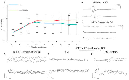 Behavioral testing and electrophysiology results in pigs. Locomotor Porcine Thoracic Injury Behavioral Scale (PTIBS) scores of FM alone (n = 5, blue line) and FM+PBMC (n = 5, red line) groups (A). No significant differences were found between the study groups throughout the study. Electrophysiology results show motor evoked potentials (MEPs) before the SCI (B) and MEPs/somatosensory evoked potentials (SEPs) 6 weeks after the SCI (C,D). After 22 weeks, no cortical or lumbar SEPs were recorded in 4 pigs of the group treated alone after FM (E). Both lumbar and cortical peaks (F) were recorded in 2 animals of the group treated with FM+PBMCs.