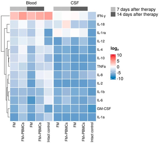 Heat maps showing cytokine/chemokine log10 concentrations, generated with the multiplex analysis of blood serum and cerebrospinal fluid before and after spinal cord injury in the study groups. Cytokine/chemokine profile on days 7 and 14 after FM or FM+PBMCs application (5 pigs in each group). A dendrogram resulting from hierarchical clustering of cytokines is shown on the left.