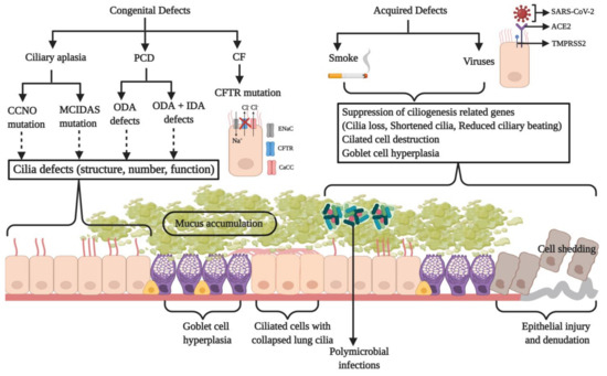 A schematic illustration of the genetic or acquired defects in the respiratory MCC apparatus that impair the clearance mechanism of the respiratory airways and lead to a diseased state. Defective cilia structure, function, or cilia loss may occur due to genetic (primary ciliary dyskinesia (PCD), ciliary aplasia), acquired (smoke), or viral factors, and they could manifest in the form of diseases like chronic obstructive pulmonary disease (COPD), asthma, and PCD where an inadequate mucus expulsion causes its build-up in the airways. During cystic fibrosis, a faulty cystic fibrosis transmembrane conductance regulator (CFTR) and goblet cell hyperplasia result in the reduction of periciliary layer (PCL) volume and mucus hyper-secretion, respectively. This causes the cilia to collapse, thereby resulting in inefficient MCC. The accumulated mucus promotes microbial colonization and the exacerbation of the disease. Microbial infections aggravate the condition and eventually damage the epithelial lining as a result of ciliated cell shedding. Illustration made using BioRender.com.