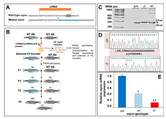 To disrupt this gene using the CRISPR/Cas9 genome editing, we designed a CRISPR RNA (crRNA) targeting exon 1 (Figure 1A). The ribonucleoprotein (RNP) complexes (crRNAs/trans-activating CRISPR RNA (tracrRNA) and Cas9 protein) were microinjected into the animal pole of AB zebrafish embryos at the one-cell stage of development (Figure 1B). The injected embryos (F0) were raised to adulthood and screened using polyacrylamide gel electrophoresis (PAGE) and Sanger sequencing for the presence of germline transmitted myoc deletions. Sanger sequencing identified mutant mosaic fishes transmitting an indel variant (c.236_239delinsAAAGGGGAAGGGGA), which was predicted to cause a frameshift in the coding region and a premature termination codon p.(V75EfsX60) (Figure 1D). These mosaics were selected as F0 founders and backcrossed with wild-type AB zebrafish to segregate off-targets, and the offspring (F1) was genotyped by PAGE (Figure 1B). Mutant F1 heterozygotes were outbred again with wild-type AB to further segregate off-target mutations in the F2 generation (Figure 1B). Finally, F3 homozygous myoc KO fish were obtained through inbreeding F2 heterozygotes. F3 genotyping by PAGE (Figure 1C) and Sanger sequencing (Figure 1D) showed agreement of the proportions of the three genotypes with the expected Mendelian ratios, indicating that myoc disruption does not affect zebrafish fertility and viability.