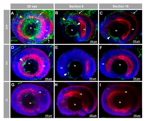 Fluorescent whole-mount immunohistochemical detection of myocilin in the eye of zebrafish embryos (96hpf). Wild-type (A–C), heterozygous (D–F) and homozygous (G–I) myoc mutant embryos were incubated with a chicken conjugated goat anti-chicken IgY secondary antibody. Three-dimensional reconstruction from z-stack scanned confocal microscopy images (A,D,G) of the eye. Optical sections (92 μm) 8 (B,E,H) and 16 (C,F,I), from the exterior ocular surface, were selected from z-stack images to show the precise localisation of the green signal in the external and internal surface of the optic cup (white arrows and yellow arrowheads, respectively), lens epithelium (white arrowhead), and dorsoposterior and ventral periocular tissues (yellow arrowheads) (A–C). Blue: DAPI nuclear staining. Green: Cy2-conjugated goat anti-chicken IgY secondary antibody. Red: tissue autofluorescence. The cross indicates the position of the embryonic axes (D: dorsal; P: posterior; V: ventral; A: anterior). The images are representative of the result observed in 10 embryos. le: lens. re: retina. The negative controls are shown in Figure S3A–C. Two-dimensional confocal image z-stacks are shown in Supplementary Video S1.