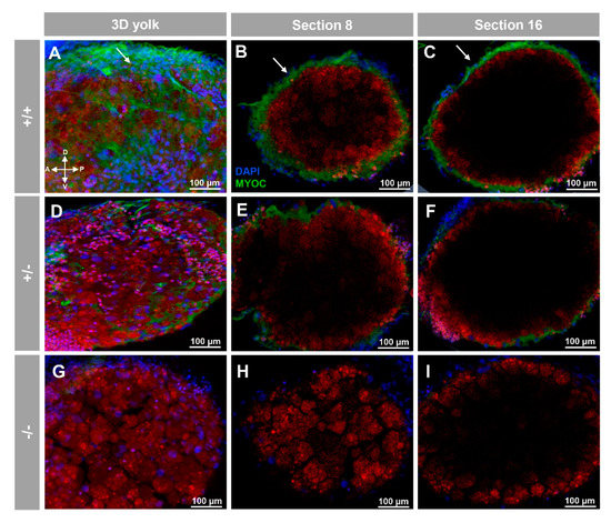 Fluorescent whole-mount immunohistochemical detection of myoc in the yolk of zebrafish larvae (96hpf). Wild-type (A–C), heterozygous (D–F) and homozygous (G–I) myoc mutant embryos were incubated with chicken anti-myocilin (TNT) primary antibody and a Cy2-conjugated goat anti-chicken IgY secondary antibody. Three-dimensional reconstruction from z-stack scanned confocal microscopy images (A,D,G) of the yolk. Sections (92 μm) 8 (B,E,H) and 16 (C,F,I), were selected from z-stack images to show the precise localisation of the green signal on the yolk’s surface (arrows) (A–C). Blue: DAPI nuclear staining. Green: Cy2-conjugated goat anti-chicken IgY secondary antibody. Red: tissue autofluorescence. The cross indicates the position of the embryonic axes (D: dorsal; P: posterior; V: ventral; A: anterior). The images are representative of the result observed in 10 embryos. The negative controls are shown in Figure S3D–F. Two-dimensional confocal image z-stacks are show in Supplementary Video S2.