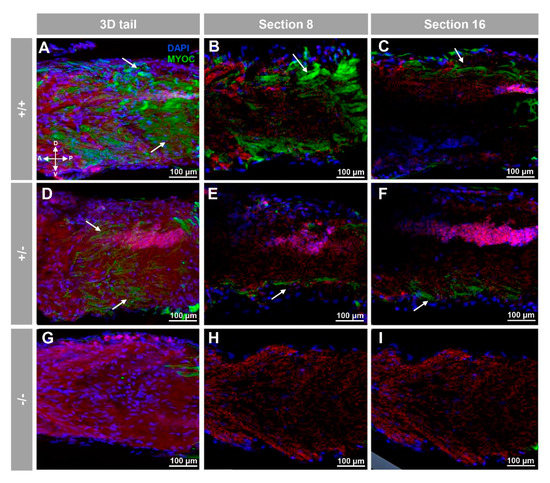 Fluorescent whole-mount immunohistochemical detection of myoc in the tail of zebrafish embryos (96hpf). Wild-type (A–C), heterozygous (D–F) and homozygous (G–I) myoc mutant embryos were incubated with a chicken anti-myocilin (TNT) primary antibody and a Cy2-conjugated goat anti-chicken IgY secondary antibody. Three-dimensional reconstruction from z-stack scanned confocal microscopy images (A,D,G) of the tail. Sections (92 μm) 8 (B,E,H) and 16 (C,F,I) were selected from z-stack images to show the precise localisation of the green signal in the tail’s skin (arrow) (A–C). Blue: DAPI nuclear staining. Green: Cy2-conjugated goat anti-chicken IgY secondary antibody. Red: tissue autofluorescence. The cross indicates the position of the embryonic axes (D: dorsal; P: posterior; V: ventral; A: anterior). The images are representative of the results observed in ten embryos. The negative controls are shown in Figure S3G–I.