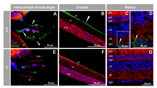 Next, we investigated the presence of myocilin in adult zebrafish ocular tissues using immunohistochemistry. We detected positive immunoreactivity in the non-pigmented ciliary epithelium, blood vessels and stroma of the iris (Figure 5A), corneal epithelium (Figure 5B), and retinal ganglion cells (Figure 5C,D). These signals were absent in −/− zebrafish (Figure 5E–G), as well as in samples treated with the preimmune antibody or blocked with the antigenic peptide (Figure S4). This also supports their specificity.
