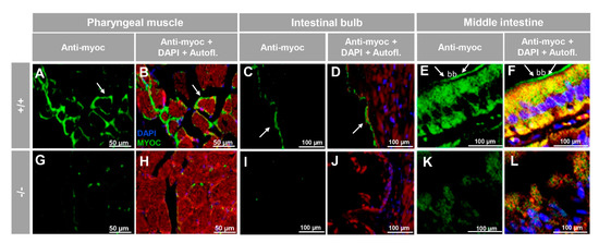 Immunohistochemistry of myocilin in non-ocular tissues of adult zebrafish. Wild-type and myoc KO adult (7 months) zebrafish tissue sections (14 μm) were incubated with a chicken anti-myocilin (TNT) primary antibody and a Cy2-conjugate goat anti-chicken IgY secondary antibody. Arrows show immunostaining in the periphery of pharyngeal muscular fibres (A,B,G,H), the enterocyte apical side in the intestinal bulb (C,D,I,J) and in the brush border of the epithelial cells in the middle intestine (E,F,K,L). Red signals correspond to tissue autofluorescence. bb: brush border. The images are representative of the results observed in three tissue sections from three animals. +/+: wild-type; −/−: myoc KO. Negative controls are shown in Figure S5.
