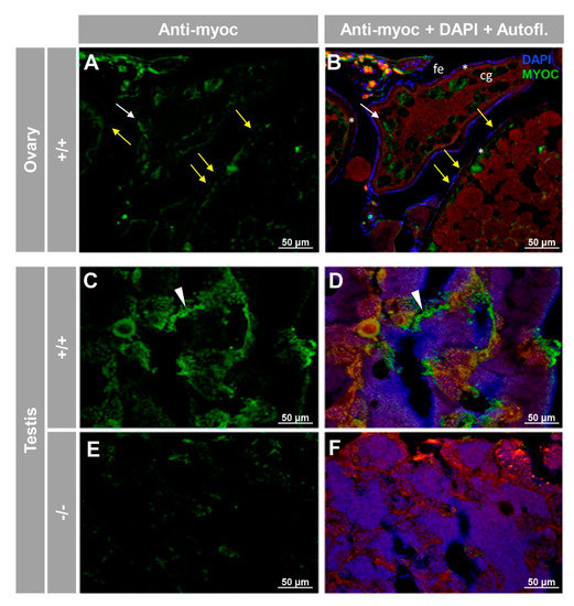 Immunohistochemical detection of myoc in the reproductive system of adult zebrafish. Tissue sections (14 μm) of adult (7 months) wild-type ovary (A,B) and testis (C,D) and KO myoc testis (E,F) were incubated with an anti-myocilin (TNT) primary antibody, followed by Cy2-conjugate goat anti-chicken IgY secondary antibody (green signals). Note that ovaries from −/− animals were not available because of the absence of females with this genotype. White and yellow arrows indicate cortical granules and follicular epithelium-associated immunoreactivity, respectively. White arrowheads show immunolabeling in the seminiferous epithelium (C,D). Red signals correspond to tissue autofluorescence. The images are representative of the result observed in three tissue sections from three animals. +/+: wild-type; −/−: myoc KO. cg: cortical granules. fe: follicular epithelium. *: zona radiata. Negative controls are shown in Figure S6.