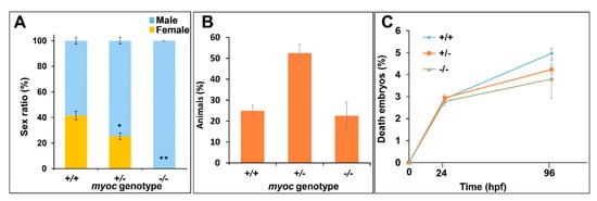 Throughout the breeding process we observed a consistent absence of females among −/− zebrafish. To confirm this observation, a total of eight different heterozygote sister–brother mating from three consecutive generations (F3 to F5) were performed. The offspring from each mating was raised to adulthood (3 months), genotyped using PAGE, and the male/female ratio corresponding to each genotype was calculated based on examination of multiple external dimorphic phenotypes, including body shape, anal fin coloration, and presence or absence of a genital papilla [50]. We observed a significant decrease in female proportion that correlated with the KO genotype, i.e., approximately 41% of +/+ animals were female, whereas this percentage was reduced to 25 and 0% in +/− and −/− zebrafish, respectively (Figure 8A). These results indicate that myocilin might play a key role in sex determination in zebrafish. As a control to evaluate the possible lethality that might be associated with the KO allele, we analysed genotype and survival proportions in the offspring of inbred myoc heterozygotes. The genotype proportions did not differ significantly from the expected Mendelian values (+/+ 25%, +/− 50% and −/− 25%, p > 0.05) (Figure 8B) and survival at 24 and 96 hpf was similar to that of embryos that were obtained from wild-type progenitors (p > 0.05) (Figure 8C).