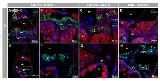 Consecutive tissue sections were employed for immunohistochemical, and TUNEL analyses of the juvenile ovary-to-testis-transforming zebrafish gonad (28 dpf) in serial cryosections from eight individuals (four +/+ and four −/−). Vasa immunostaining on tissue section one confirmed the presence of the juvenile gonad in the ventral side of the swim bladder and above the intestine of both +/+ (Figure 9A,B) and −/− (Figure 9E,F). Myocilin immunodetection on tissue section two revealed some positive cells in +/+ juvenile gonads (Figure 9C, arrows). As expected, myocilin immunoreactivity was absent in −/− gonadal tissue (Figure 9G), indicating that the signal was specific. Given that oocyte apoptosis participates in the mechanism of testicular and ovarian differentiation in the larval-juvenile zebrafish transition [51], we also investigated gonadal apoptosis in KO animals using a TUNEL assay on tissue section four. No positive cells were observed in none of the +/+ gonads obtained from four individuals (Figure 9D), indicating that they corresponded to juvenile females. In contrast, the germinal tissue of −/− animals showed many TUNEL positive primordial germ-like cells, characterized by large and round nuclei (Figure 9H, arrows). Small nucleated cells that were located in the outer intestinal wall, were also positive for TUNEL staining (Figure 9H, arrowheads). The absence of labelling in the respective negative controls (tissue sections four to six) supported the specificity of the results (Figure S10A–C).