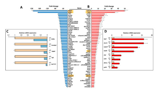 We selected the top-50 down- (Figure 10A and Table S2) and upregulated (Figure 10B and Table S3) genes for further analyses. Complementary gene ontology functional enrichment analysis in the group of top-50 up-regulated genes using ShinyGO [48] showed significant DEGs in several categories including biosynthetic and catabolic processes and regulation of metabolic processes (Table S4), in accordance with the general KEGG analysis. In addition, categories such as developmental processes, anatomical structure development and reproduction were also significantly enriched in this group. On the other hand, the cluster of top-50 down regulated genes showed significant DEGs in categories mainly related with biosynthetic processes, reproduction, meiosis, SMAD signal transduction and cell cycle (Table S5). To validate the transcriptome results by qRT-PCR we selected the two most upregulated (tuba7l and irg1l) and the two most downregulated (plpp4 and grik3). In addition, nine selected DEGs with absolute fold change values greater than 2.0, were also re-assessed by qRT-PCR. This group included five representative genes known to play key roles in zebrafish sexual differentiation (dmrt1, amh, sycp3, cyp11a1 and star) and four Wnt genes that were also underexpressed in the myoc KO transcriptome (dkk1a, lef1, ctnnbip1 and dvl3a). The Wnt genes were selected because of the role of Wnt signalling in zebrafish sex differentiation and the proposed role of myocilin as a Wnt modulator.