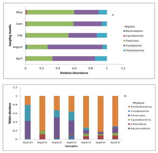 - Parveen, S.; Rasool, F.; Bhatti, E.; Anwar, A.; Chaughtai, M. Seasonal variations in the intestinal bacterial flora of Oreochromis niloticus cultured in farms. J. Biodivers. Environ. Sci. (JBES) 2015, 6, 2220–6663. [Google Scholar]