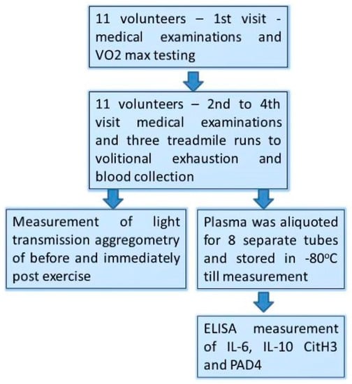 Histones which together with DNA form nucleosomes, the basic units of chromatin, can be found in circulating plasma both in healthy subjects and in those with some diseases. Extracellular histones released mainly due to cell death have been implicated in the pathogenesis of various serious diseases such as trauma-induced multiple organ dysfunction, sepsis, autoimmune diseases, ischemic heart disease, or even as markers of severity in COVID-19 infection [,,,,]. Histones and nuclear DNA (nDNA) might be released from the cellular nucleus separately, simultaneously as nucleosomes or as a component of neutrophil extracellular traps (NETs) when internal structures are released to bind and kill invading microbes []. This process is accompanied by a rise in a variety of circulating cytokines including IL-6 and IL-10 []. Modification of histone H3 by citrullination is catalyzed by the enzyme peptidylarginine deiminase 4 (PAD4). Weakened binding of citrullinated histone H3 (H3Cit) to negatively charged DNA leads to chromatin decondensation and PAD4/CitH3 dependent NETs formation []. Thus, H3Cit is recognized as an in vitro and in vivo marker of NETosis [,]. Apart from pathological processes, increased NETosis was described as an integral part of body’s response to vigorous physical exercise []. Some studies have proved that cell-free nuclear DNA (cf nDNA) rises in response to various types of exercises [,,,]. The exercise-induced increase in cf nDNA was many times higher than changes in other biomarkers of metabolic adaptation and muscle damage. Hence, the plasma concentration of cf nDNA seems to be an efficient marker of exercise load and its persistent elevation could be associated with the increased risk of occurrence of overtraining syndrome in athletes []. In our previous studies, we found that three repeated bouts of exhaustive treadmill exercise caused the increase in cf nDNA without development of tolerance and decreased the integrity of post-exercise cf nDNA correlated with increased post-exercise whole blood chemiluminescence [,]. Because nDNA is wrapped around an octamer of (two H2A, two H2B, two H3, and two H4) histones, it may be expected that exercise would result in an increase in plasma histones concentrations. This hypothesis is supported by the observation of exercise-induced increment of another nuclear protein HMGB1 in humans [,]. Extracellular histones can act by the direct interaction with the phospholipid bilayer proceeded by the loss of endothelial membrane barrier function [], whereas endothelial cells are crucial regulators of vascular hemostasis, and play a pivotal role in the mechanism underlying the development of vascular disorders []. Extracellular histones are also able to interact with platelets indirectly, through TLR receptors. Moreover, in vitro-generated NETs induced distinct aggregation of washed human platelets, while excess and prolonged interaction of NETs with platelets in vivo can cause severe inflammation and host organ damage [,]. Pharmacological inhibition of histone release, their neutralization in the circulation or inhibition of histone-evoked signal transduction reduced significantly mortality in an animal model of multiple organ injury []. To the best of our knowledge, none of the previous studies has investigated the effect of exercise on the concentration of extracellular histones in humans plasma. Therefore, in this study, we aimed to evaluate changes in the extracellular H3Cit, and PAD4 in response to three bouts of exhaustive treadmill run separated by seventy two hours resting period. Furthermore, the associations between plasma histone concentration and cf nDNA, platelet activity, selected cytokines, and markers of metabolic response to exercise were analyzed. In this study we would like to verify how selected factors behave in response to exercise and thus also confirm or deny the harmful impact of circulating histones.