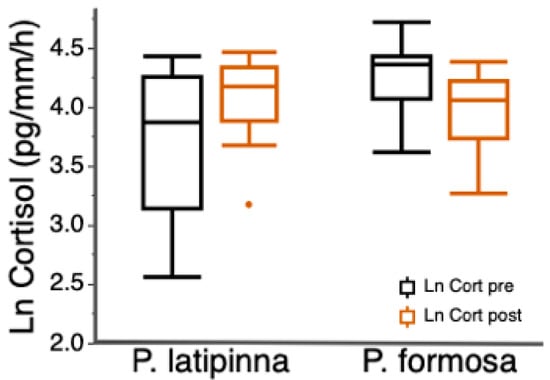 Mean cortisol release rate (ln pg/mm/h) for female P. latipinna and P. formosa before the behavioral trial (Pre-trial cortisol) and immediately after the behavioral trial (post-trail cortisol). Box plots indicate median, range, and first and third quartiles, dot represents an outlier.