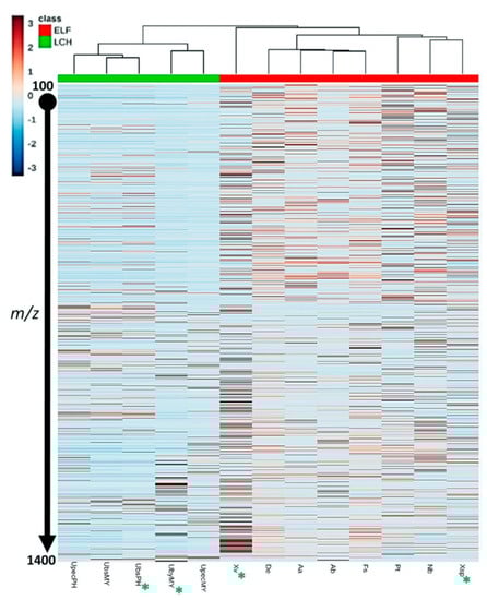 Heatmap and dendrogram of crude lichen and ELF extracts. The presence of more red bars indicates higher diversity in their chemical profile. Those marked with an asterisk (*) were chosen for further fractionation work (ELF: endolichenic fungi, LCH: lichen).