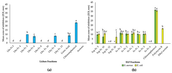 Biological activities of lichen and ELF fractions. (a) Antibacterial activities of U. bismolliuscula (PH, UbsPH) and U. baileyi (MY, UbyMY) fractions against S. aureus ATCC 25923. (b) Antibacterial activities of Xylaria sp. (MY, Xsp) and X. venustula (PH, Xv) fractions against S. aureus ATCC 25923 and E. coli ATCC 25922. Standard deviation values are indicated by the error bars (p < 0.05). Letters above error bars indicate the statistical significance within groups using one-way ANOVA and Tukey HSD. a, b, c, d different letters indicated on the columns denote statistical significance between respective fractions.