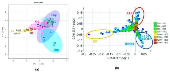 Multivariate analyses of the LC–MS data of 36 lichen and ELF crude extracts (including the reference (+)-usnic acid) and selected fractions. (a) principal component analysis (PCA) scores plot revealed distinct Xv fractions away from the overlapping clusters. (b) Encircled features on partial least squares discriminant analysis (PLS-DA) loading plot generated from SIMCA revealed metabolites (in molecular weight) responsible for the separation of the respective taxonomical groups. (ELF: endolichenic fungi, UBS: U. bismolliuscula, UBY: U. baileyi, USP: U. pectinata, XSP: Xylaria sp., XV: X. venustula). The pq vectors indicate 99.87% and 99.45% influence of individual X- and Y-variables, respectively, to the model suggesting very good prediction of underlying patterns in the data.