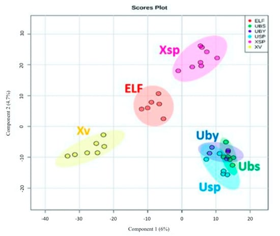 In this study, PCA, an unsupervised MVA method, was performed using LC-HRMS data. The score scatter plot gave an overview of the samples’ chemical profiles, while determining the relationship between groups [36]. In this study, the generated PCA showed the groupings of samples based on their secondary metabolite profiles. R2 at ca. 0.99, Q2 > 0.72, and an accuracy of 1 suggested good fit and predictive power of the model. The generated score scatter plot revealed very good separation between the lichen hosts and their associated ELF. The Xylaria samples, Xv and Xsp, were distinctly situated farthest from the main ELF cluster, which suggests the uniqueness of their chemical profiles. Such an observation supports the hypothesis that ELF produce metabolites distinct from their lichen hosts [17].