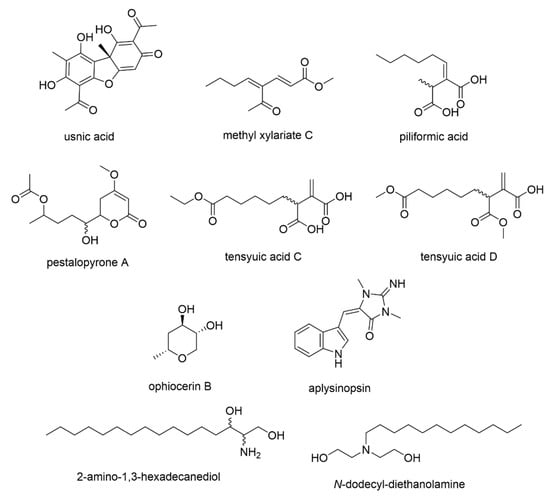 As symbiotic organisms, lichens are known as unique sources of bioactive secondary metabolites called lichen substances [1]. The mycobiont, which is the fungal component of the lichen, is reported to produce approximately 1000 chemically diverse lichen substances [2]. Most of these metabolites are unique to lichens, with only a small portion occurring in fungi and higher plants [3]. These substances were found to exhibit significant biological activities including antibacterial [4], antifungal [5], anti-inflammatory [6], antioxidant [7], antiviral [8] and cytotoxic [9] activities. Nevertheless, their slow growth in nature limits the widespread application of these substances, particularly for pharmaceutical uses [10]. In addition, overcollection of lichens impacts their conservation. Hence, other fast-growing and easily cultured organisms, in contrast to slow-growing lichens, are prioritized. Interestingly, a group of asymptomatic fungi that resemble plant endophytes was discovered thriving inside healthy lichen thalli [11,12]. This group of fungi, known as endolichenic fungi (ELF), was first described in 1990 [13]. In our other study, we reported very diverse species of ELF from Usnea which differed significantly between geographic origins—e.g., Philippines vs. Malaysia [14,15]. Since then, over 35 species of ELF have been isolated and characterized [16]. Furthermore, ELF are also known to possess secondary metabolites that are hypothesized to be distinct from those produced by lichens [17]. Few studies, however, have been conducted to specifically view such distinction. Since the first report on the metabolites produced by ELF in 2007 [18], a tremendous increase in the number of compounds has been described. To date, 351 secondary metabolites produced by ELF have been characterized and identified, 196 of which were novel [16]. These metabolites consisted of a diverse array of structural types that included alkaloids, quinones, oxygenated heterocycles, aromatic compounds, terpenes, peptides, steroids, and allylic compounds, which were also known to exhibit various biological activities [19,20,21,22,23]. ELF have therefore offered another avenue for drug discovery.