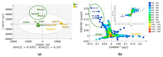 Multivariate analyses of 36 lichen and ELF crude extracts and selected fractions to predict the antibacterial metabolites in the Xylaria samples (Xsp and Xv). (a) Orthogonal projection to latent structures discriminant analysis (OPLS-DA) score scatter plot of samples categorized according to their bioactivities. (b) OPLS-DA loadings and S-plots with encircled features represent the bioactive metabolites of the most active samples. Active metabolites are on the left quadrants while inactive features are on the right quadrants. The pq and poso vectors indicate 94.80% and 90.27% influence of individual X- and Y-variables, respectively, to the model suggesting good prediction of underlying patterns in the data.