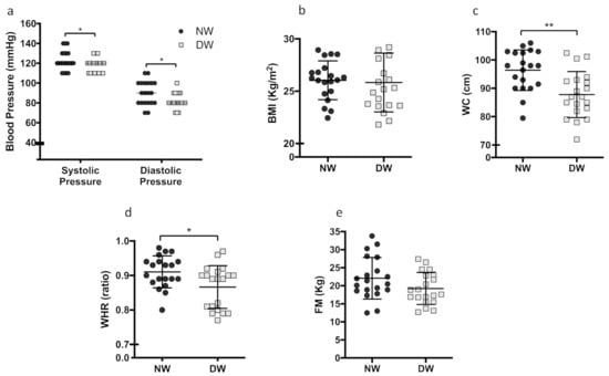 The blood pressure assessment showed that NW has an increase in systolic and diastolic pressure compared to DW (4.6% (p = 0.0496) and 9.7% (p = 0.0172), respectively) (Figure 2a). The body mass index (BMI) did not differ between groups (p = 0.7801) (Figure 2b). However, the waist circumference was significantly increased in the NW group by 9.8% (p = 0.0010) (Figure 2c). When analyzing the waist–hip ratio (WHR), we noticed an increase of 4.6% (p = 0.0153) in the NW group compared to the DW group (Figure 2d). Lastly, there was no difference in the total fat mass between NW and DW (p = 0.0887) (Figure 2e). No significant differences were found between genders.