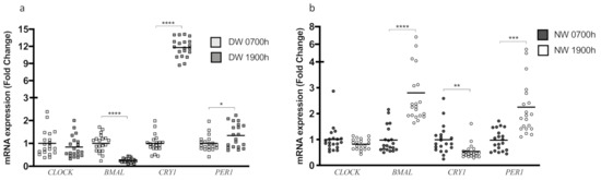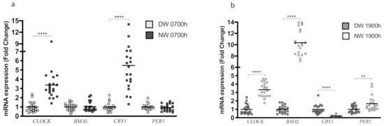 The study of the mRNA expression of clock genes from PBMC samples collected at 0700 h and 1900 h indicated that in the DW group, BMAL1 expression presented a robust reduction at 1900 h (p < 0.0001) but no change in CLOCK expression (p = 0.3980) (Figure 3a). However, the expression of CRY1 and PER1 showed an increase at 1900 h compared to 0700 h (p < 0.0001; p = 0.0330 respectively) (Figure 3a). In the NW group, CLOCK expression did not differ between 0700 h and 1900 h (p = 0.1465) (Figure 3b). In contrast, the expression of BMAL1 was significantly higher (p < 0.0001) and CRY1 was significantly lower (p = 0.0043) at 1900 h compared with 0700 h (Figure 3b). Here, we observe an interesting inversion of gene expression patterns between DW and NW groups (0700 h vs. 1900 h). Finally, the PER1 expression was increased at 1900 h (p = 0.0001) (Figure 3b).