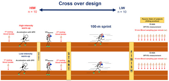 The study was conducted in a cross-over design and all participants were randomly assigned to either the HIW or the low-intensity warm-up (LIW) groups (Figure 1). Each session was separated by at least two days and other conditions were kept the same, except for warm-up intensity. Before the warm-up, participants had their first resting blood lactate concentration sampled (mmol·L−1; [La−]Rest1). They completed each warm-up session (either HIW or LIW), and then carried out five minutes of recovery in a standing position to measure resting oxygen uptake (VO2). Before the 100-m sprint, each participant had their second lactate concentration measured ([La−]Rest2). Following this, they performed the 100-m sprint at maximum effort. Participants were rested in the seated position for passive recovery after the 100-m sprint to analyze VO2 (6-min) and La− (10-min for every 1-min interval). The study was conducted in the evening (18:00–21:00), which was the participants’ normal training time.