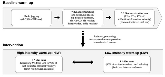 Each warm-up session was composed of two parts (Figure 2). Both HIW and LIW involved a baseline warm-up (10 min of jogging, dynamic stretching, and three 60-m runs), followed by the interventional warm-up (eight 60-m runs at different intensities [29]. The target heart rate during jogging was set between 117 and 146 beats·min−1 (Figure S1), based on calculations using the prediction equation [30]. A five-minute rest was allowed between baseline and interventional warm-ups, and one minute between 60-m runs. In the case of HIW, intervention warm-ups were conducted at 60 to 95% of each individual participant’s self-estimated maximal speed. LIW was performed at 40% of self-estimated maximal speed. Finally, following completion of each warm-up session, athletes rested for five minutes and then performed the 100-m sprint at their maximum capacity.