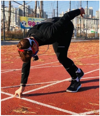 Ten young male sprinters with 4.3 years (personal records: 11.57 ± 0.66 s) competitive experience participated in this study (Table S1). The participants’ anthropometric parameters, presented as means ± standard deviation (SD), are as follows: age 16.8 ± 1.1 years, height 175.7 ± 4.6 cm, weight 67.6 ± 4.9 kg, and BMI 21.9 ± 1.0 kg·m−2. All participants trained at least five days per week for an average of three hours (18:00~21:00) per day. Each participant provided informed consent after being informed of the study objective and procedure. The study was approved by the Institutional Ethics Committee of CHA University (1044308-202001-HR-001-01). The applied protocols are according to the Declaration of Helsinki.