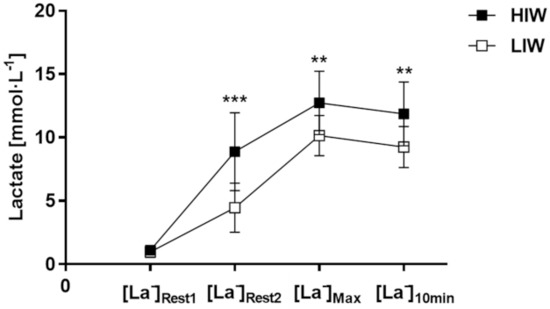 Blood lactate concentration. Mean values (± standard deviation) for HIW (open circles) and LIW (closed squares), before warm-up ([La−]Rest1), after warm-up ([La−]Rest2), at the highest lactate concentration after 100-m sprint ([La−]Max), and for 10th lactate concentration ([La−]10min), ** (p < 0.01), *** (p < 0.001).