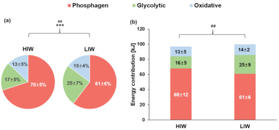 100-m sprint time trial. Mean values (± standard deviation). Estimated relative (a) and absolute (b) energy system contribution in HIW and LIW. *** Phosphagen system (HIW vs. LIW), ## Glycolytic system (HIW vs. LIW), ## (p < 0.01), *** (p < 0.001).