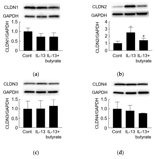 IL-13 was used to build another pathological model to investigate the effect of butyrate. The addition of IL-13 to the basolateral side of the insert resulted in a significant decrease (compared to the medium-treated control) in TEER after 24 h of stimulation (Figure 3a). IL-13 exposure significantly increased the claudin-2 protein level while resulting in nominal decreases in the level of claudin-1. Levels of claudin-3, claudin-4, occludin, and ZO-1 did not appear to be affected (Figure 4, Supplementary Figure S3).