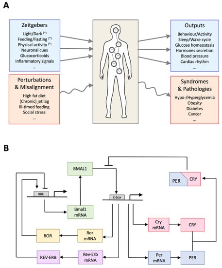 In mammals a large range of physiological and metabolic processes display a 24 h rhythmic pattern. These processes are controlled by an elaborate circadian system consisting of a finely tuned network of clocks throughout the body coupled together by periodically released hormones, nutrient sensors, and neuronal connections. Besides controlling the sleep–wake cycle, this system appears to be optimized to ensure metabolic homeostasis (by allowing anticipation of food uptake), an effective immune response, and synchronized cell division [,]. It relies on the alignment of the light–dark cycle and the feeding–fasting pattern and on a precise genetic clockwork. Dysregulation of this system, through genetic mutations or through alteration of the timing of zeitgebers (jet lag, shift work, ill-timed food intake, etc.) can lead to metabolic syndromes and pathologies, including obesity, diabetes, auto-immunity, and tumorigenesis and cancer [,]. By “zeitgeber” we refer to any periodic input that entrains the circadian clock, with light and food being external zeitgebers, while hormones and neuroal projections are internal zeitgebers.