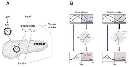 The circadian system allows the organisms to adapt to normal environmental and feeding conditions by anticipating daily changes and, thus, helping them to remain in a homeostatic, healthy state. The proper working of the circadian system, however, relies on the alignment between the environmental lighting conditions and feeding time. By “alignment” we mean that the timings of these external cues are such that the circadian clock system can anticipate these changes and, thereby, guarantee an optimal adaptation. For example, by regulating the transcription of genes involved in insulin secretion, the pancreas prevents an excessive accumulation of blood glucose []. The liver also plays a critical role in the maintenance of glucose homeostasis through the circadian regulation of gluconeogenesis [,]. There is an increasing amount of evidence showing that circadian disturbances lead to metabolic syndromes and pathologies such as diabetes in humans. These disturbances include shift work, wrong eating timing, sleep loss, and chronic jet lag [,,,,,].