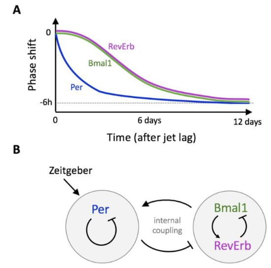 Two hypotheses have been put forward to explain the observations: desynchronization at the single-cell level or emergence of two groups of cells in which either Per or Bmal1 is predominant []. A surrogate data analysis of the experimental time series published by Kiessling et al. [] supports the first hypothesis []. Schmal et al. [] designed a conceptual mathematical model to show how internal dissociation can result from the decoupling between two autonomous oscillatory circuits (Figure 4B). This model is based on the hypothesis that Per and Bmal1/Rev intracellular regulatory feedback loops can independently generate oscillations. After calibration of the model to reproduce experimentally measured resynchronization times after a jet lag, they estimated the intrinsic period of each oscillator as well as its coupling strength. They also successfully reproduced these results with a minimal model and with a more detailed molecular model. The desynchronization of the Per and Bmal1/RevErb dynamics is obtained provided that Per and Bmal1/RevErb submodels can be dissociated. The latter model allows to link the coupling strength to an actual regulatory process, namely the strength of inhibition of RevErb transcription by PER protein. Modeling thus constitutes a valuable tool to interpret experimental data and to reveal design principles of the molecular architecture. The next step will be to understand how such an internal twist affects circadian outputs, such as the release of hormones and the metabolic activity.