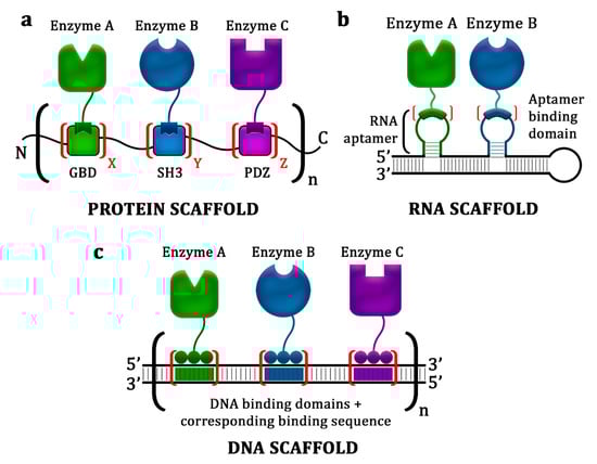 Compared with proteins, nucleic acids are more predictable in structure and easier to manipulate [8]. Furthermore, the ready availability of bioinformatic tools (e.g., the Mfold and RNAfold web servers) for designing synthetic nucleic acid structures, along with the wide range of nucleic acid-binding domains and aptamers, allows the construction of scaffold systems that can arrange bound protein in a specific manner [47,48,49]. RNA and DNA scaffolds can be manipulated easily for a higher degree of flexibility, simply by changing the distance between the protein-binding sites and/or the adding polymerization domains [23]. Similar to the protein scaffold systems, nucleic acid scaffolds have already been applied on various biosynthetic pathways (Table 2).