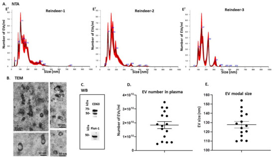 Plasma EV profiling of Rangifer tarandus. (A) Nanoparticle tracking analysis (NTA) showing a poly-dispersed distribution of reindeer plasma EVs in the size range of 30–400 nm, from three representative animals, showing some individual variation. (B) Transmission electron microscopy (TEM) analysis of EVs derived from reindeer’s plasma; the scale bar in all images represents 50 nm. (C) Western blotting analysis (WB) showing reindeer plasma EVs positive for CD63 and Flot-1; the molecular weight standard is indicated in kilodaltons (kDa). (D) Scatter plot representing EV number in reindeer plasma, showing some variation in plasma EV concentration between animals (n = 16). (E) Modal size of EVs in plasma of individual animals indicates some individual variation, with modal plasma EV size in the range of 110–150 nm, similar as seen in the NTA graphs in A; (n = 16). Error bar in D and E represents standard deviation (SD).